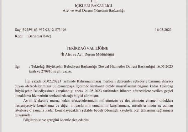 Valiliğe gönderilen yazıda şu ifadeler yer aldı: "Tekirdağ Büyükşehir Belediyesince karşılandığı ancak 21.05.2023 tarihinden itibaren afetzedelere verilen geçici konaklama hizmetinin sonlandırılacağı bilgisi alınmıştır. Asrın felaketine maruz kalan afetzedelerimizin milletimizin ve devletimizin emaneti oldukları hassasiyetiyle konaklama ve diğer ihtiyaçlarının tamamının karşılanması, misafirlerimizin ne zaman isterlerse o zamana kadar konaklayacakları şekilde bedeli ödenmek kaydıyla otel tahsisinin sağlanması hususunda; bilgilerinizi ve gereğini önemli rica ederim."