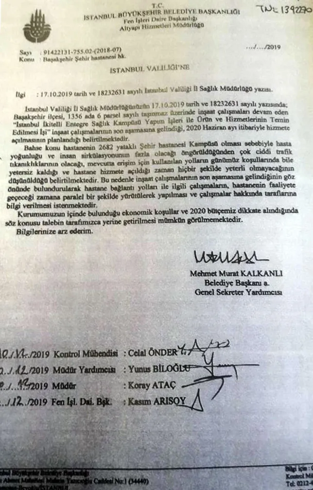 İstanbul Büyükşehir Belediyesi Genel Sekreter Yardımcısı Mehmet Murat Kalkanlı'nın İstanbul Valiliği'ne gönderdiği yazıda; İstanbul Büyükşehir Belediyesi'nin, Başakşehir Şehir Hastanesi'nin bağlantı yollarıyla ilgili çalışma yapamayacağı belirtilerek, "Kurumumuzun içinde bulunduğu ekonomik koşullar ve 2020 bütçemiz dikkate alındığında söz konusu talebin tarafımızca yerine getirilmesi mümkün görülmemektedir" denildi.