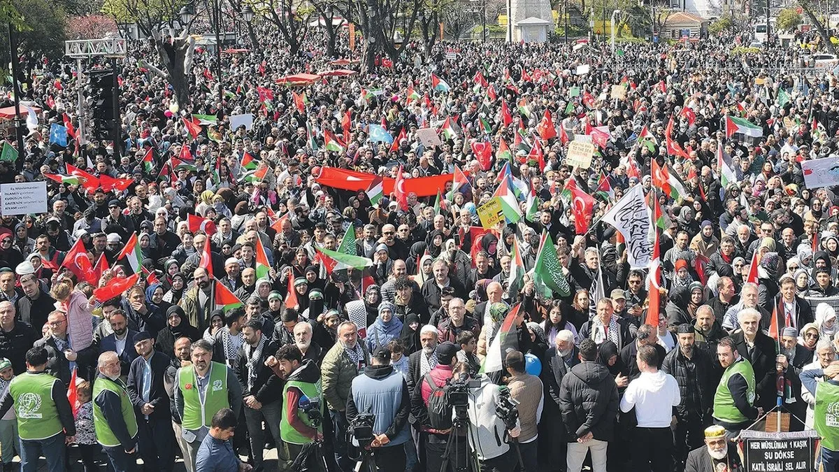 İSTANBUL: Beyazıt Meydanı'nda toplanan on binlerce kişi, Ayasofya Camii'ne doğru yürüdü. Türk bayrağı ve Filistin bayrağı taşıyan grup, "Hamas'a selam, direnişe devam", "Katil İsrail, iş birlikçi ABD" diye sloganları attı. Yürüyüşe İHH Genel Başkanı Bülent Yıldırım'ın yanı sıra AK Parti İstanbul milletvekilleri Süleyman Soylu, Hasan Turan, AK Parti Trabzon Milletvekili Adil Karaismailoğlu, AK Parti Mersin Milletvekili Nureddin Nebati de katıldı. Ayasofya önüne ulaşan on binler burada okunan Kuran-ı Kerim tilavetini dinledi.