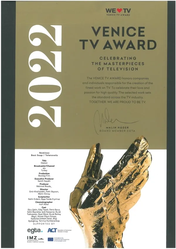 atv ekranında büyük ilgi gören yapımını Bozdağ Film'in gerçekleştirdiği 'Destan', 27 farklı ülkeden katılımın gerçekleştiği birçok platformlardan adayların olduğu, dünyanın en iyi TV yapım ve yapımcılarının ağırlandığı Venedik TV Ödülleri kapsamında, En İyi Telenovela kategorisinde aday seçilerek başarısını bir kez daha gözler önüne serdi.