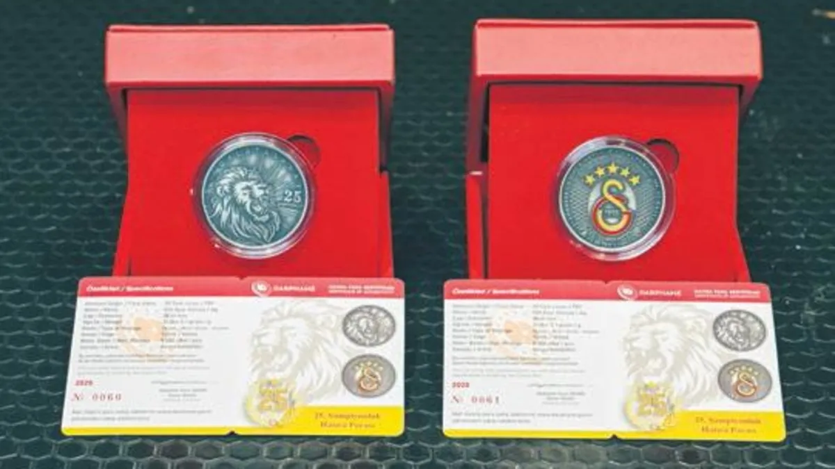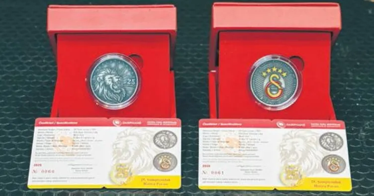 SÜPER Lig'de 25. şampiyonluğa ulaşıp 5. yıldızı göğsüne takan Galatasaray için Darphane ve Damga Matbaası Genel Müdürlüğü hatıra para çıkarma kararı aldı. Sanatçı Birsen Kendirci'nin tasarladığı hatıra para, 925 ayar gümüşten üretiliyor. 5 bin adet basılacak para, 38,61 milimetre çapında ve 31,10 gram ağırlığında olacak. Yüksek koleksiyon değeri taşıyacak hatıra parası, 2 bin 250 Türk Lirası'ndan satışa çıkacak. Darphane Dairesi Başkanı Şenol Yıldız, 2 yıl içinde paranın tamamının piyasaya çıkacağını duyurdu.