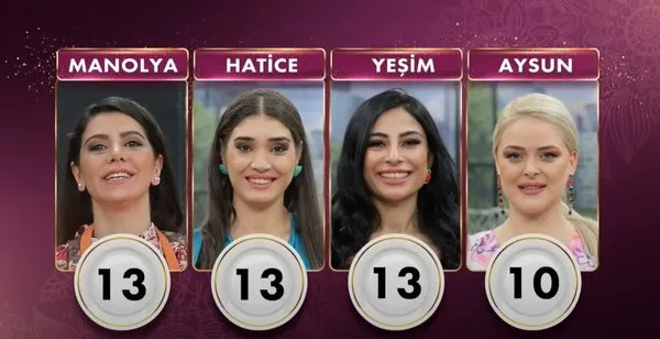 Gelinim Mutfakta dün üç gelin 13 puanla birinci oldu. Kura sonucu çeyrek altını alan yarışmacı Manolya oldu.