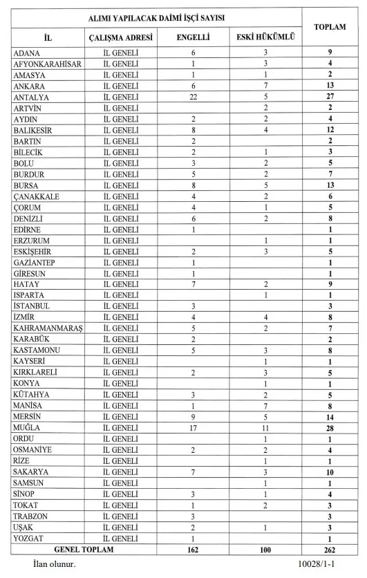 Orman Genel Müdürlüğü işçi alımı 162 adet engelli ve 100 adet eski hükümlü/TMY statüsünde toplam 262 adet daimi işçi alımı yapacak. Açık iş ilanları 29.09.2025 – 03.10.2025 tarihleri arasında İŞKUR üzerinden yayımlanacak ve başvurular alınacak.