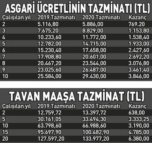 2019'un ikinci yarısında uygulanan rakam 6 bin 379 lira 86 kuruş olmuştu. Bu tutara memurlara yapılacak yüzde 4, ocak zammı ve enflasyon farkı da eklenecek. Sadece zam eklendiğinde kıdem tazminatı tavanı 6 bin 635 lira olacak. Yüzde 11-12 arasında beklenen yıl sonu enflasyonuna göre bu artış yüzde 5'i bulacak. Bu durumda kıdem tazminatı tavanı 6 bin 698 lira 86 kuruşa çıkacak. Kıdem tazminatı, çalışılan yılla son brüt ücretin çarpılması sonucu bulunduğu için 2020'deki tazminatlar yeni ücret üzerinden hesaplanacak. Örneğin 10 yıldır çalışan bir asgari ücretli işçinin kıdem tazminatı 2019'da 25.584 lira olurken, bu rakam 2020'de 29.430 liraya çıkacak. Böylece çalışan 3 bin 846 lira daha fazla para alacak.