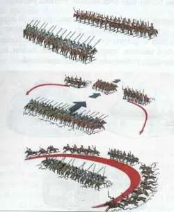 Taktiğin ikinci aşamasında ise sağ ve sol kanattaki süvari birlikleri devreye girerdi. Düşman birliklerinin taarruzunu gören süvariler harekete geçip arkalarına sızarlardı. Süvarilerin çevirme harekâtı tamamlandıktan sonra düşmanı pusuya çeken merkez kuvvetleri geri dönerek düşman üzerine aniden saldırıya geçerdi. Düzeni ve disiplini bozulmuş düşman birlikleri son aşamada kuşatılarak imha edilirdi.
