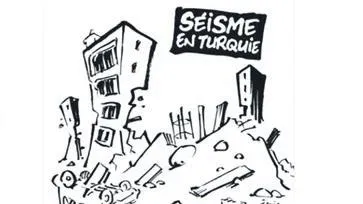 Fransız Charlie Hebdo dergisinden depremde de yine aşağılık bir karikatür geldi. Yıkık bina çiziminin yanına iliştirilmiş bir yazı: "Türkiye'de deprem: Tank göndermeye bile gerek yok!" (Siz çoktan insanlığın altında ezilip kaldınız. Sadece şimdilik bundan haberiniz yok)