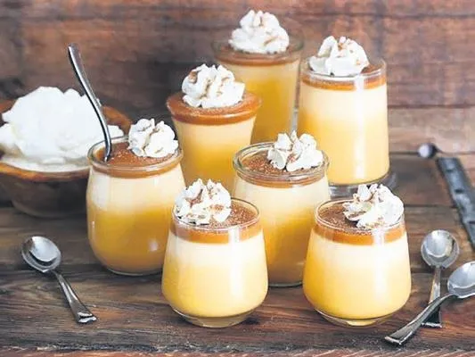 YAPILIŞI: Bir kabın içine süt, nişasta ve jelatini koyup çırpıyoruz. Bir tencerenin içine kremaları boşaltıp üzerine toz şekeri serpip karıştırıyoruz. Sürekli karıştırarak kaynayana kadar pişiriyoruz. Kaynamaya başlayan kremanın içine süt, jelatin ve nişastalı karışımı döküp karıştırmaya devam ediyoruz. Kaynama noktasına gelip koyulaşana dek pişiriyoruz. Bal kabağı püresi için; bal kabağını, portakal suyunu ve toz şekeri pişiriyoruz, blender'dan çekiyoruz. Pudingleri servis kaselerine döküp bir saat buzdolabında soğuttuktan sonra üzerine bal kabağı püresini ekliyoruz.
