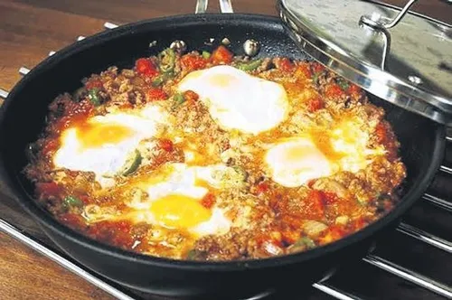 YAPILIŞI: Soğanları ince ince doğrayın. Zeytinyağını tavaya alıp, soğanları pembeleştirin. Kıymayı ekleyip kavurun. Sırasıyla biber, domates, baharat ve salçayı ekleyin. Kavurmaya devam edin. Suyunu çekince maydanozları ekleyin ve yumurtaları kırın. Zevkinize göre tamamen dağıtabilir ya da göz göz pişirebilirsiniz.