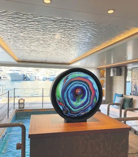Yat tasarımı konusunda başarılı iki isim Baran Akalın ve Doğa Naz Cebeci'nin süper yatlarında sanat ağırlıklı salon alanı ve kamaralar dikkat çekiyor. Örneğin eğlenceli bir sanat galerisi görüntüsünde tasarlanmış üst güverte lobisinde iki büyük Fatih Sazak resmi sizi karşılıyor. Fatih Sazak'ın yaşam döngüsünün ilk sembolü Maça Serisi kara canlılarının hayatta kalma mücadelesini konu alıyor. Döngünün en güçlü kartı Maça Papazı, en güçlü avcı olan aslan olarak karşımıza çıkıyor.